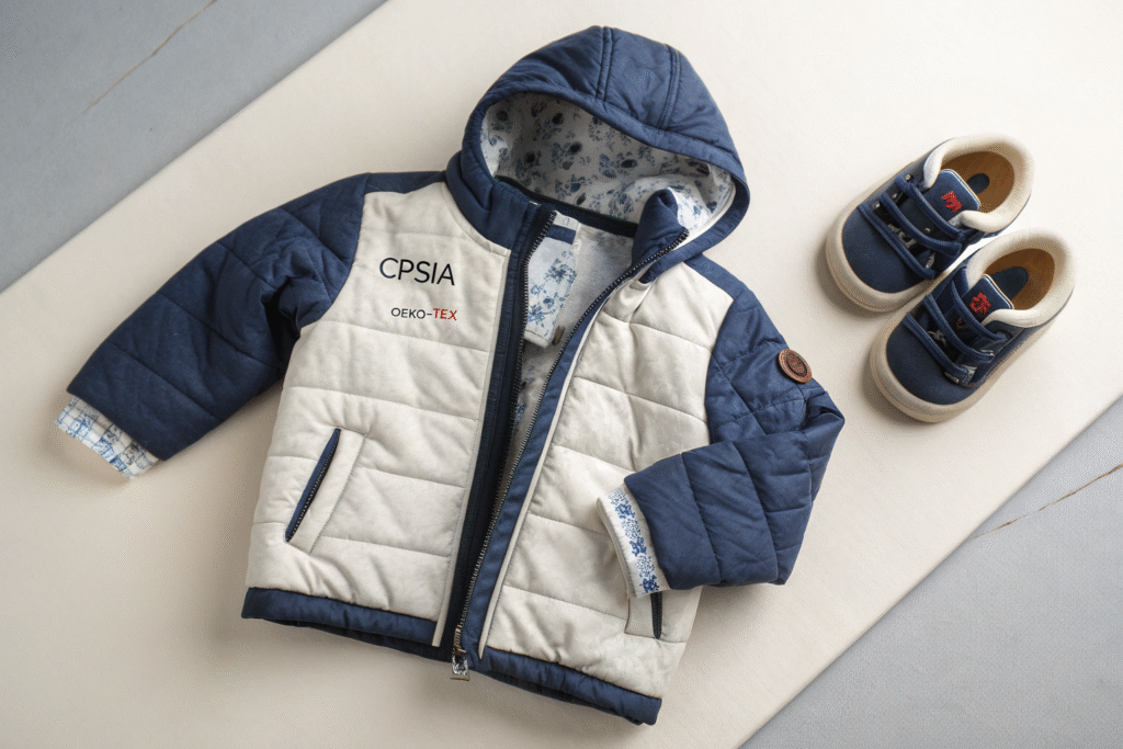 Waterproof toddler garments sold in the US must pass CPSIA, OEKO-TEX, and in some cases California Prop 65. For EU markets, REACH and EN 14682 also apply.